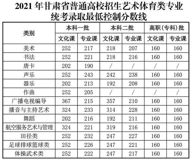 2021年甘肃省普通高校招生艺术体育类专业 统考录取最低控制分数线