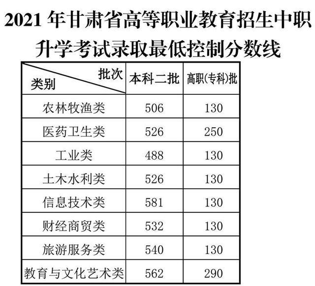 2021年甘肃省高等职业教育招生中职 升学考试录取最低控制分数线