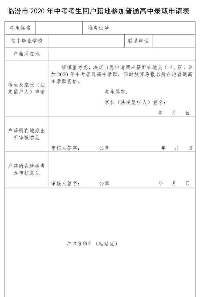 附件:临汾市2020年中考考生回户籍地参加普通高中录取申请表