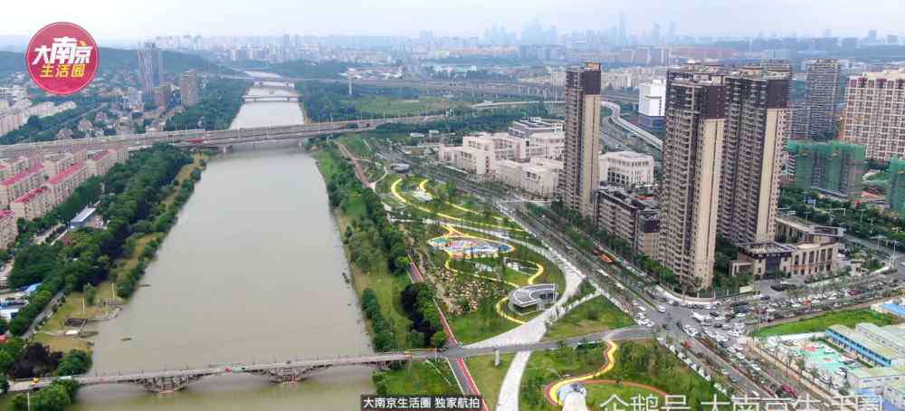 根据规划,目前商务区的完成度还不是特别高,更高的建筑集中在临河的最南端,并且中间还有一条长达1公里的绿轴公园。目前秦淮新河的北岸,已经建成了一片非常漂亮的河滨公园,运动设施齐备,篮球场、羽毛球场、乒乓球桌都有。