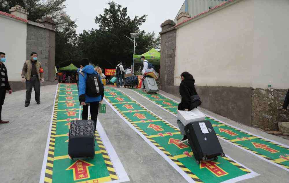 与平常成群结伴不同,此次开学,同学们在校门口老师的指引下,单独一人或与一位协助推行李车的老师、保安进入校园。沿着地面绿色标识行走,到达“行李物品消毒点”,老师为学生的行李物品进行消毒后,学生方可继续前行测量体温,再过检测门,最后前往宿舍楼按新安排的床位入住。