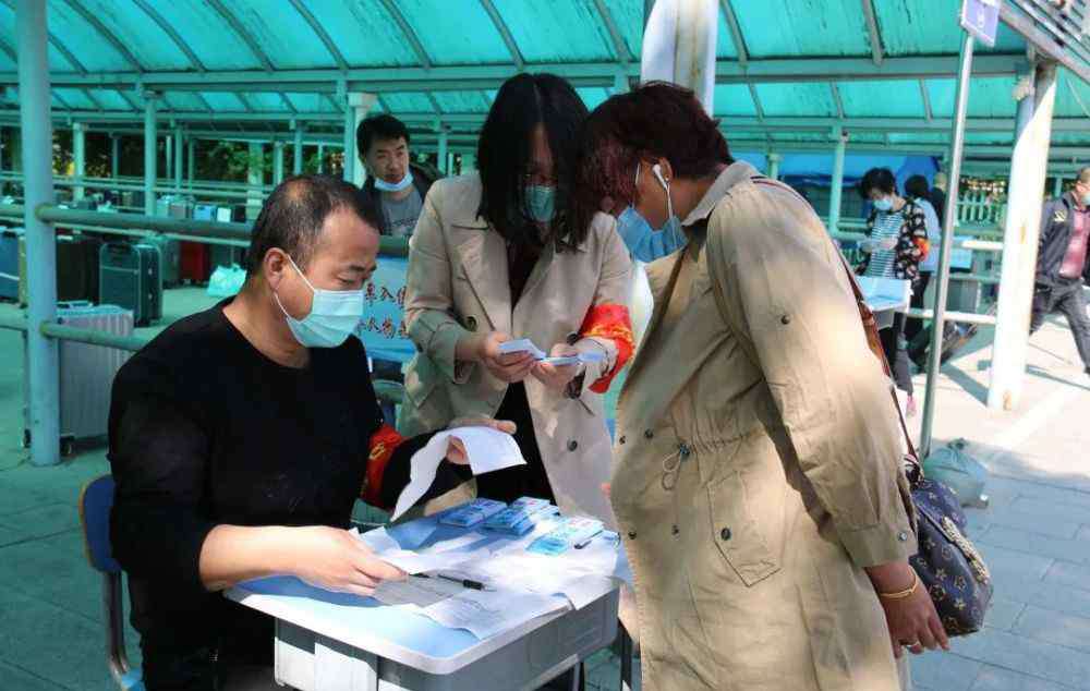 进入交换区前,家长有序测量体温。随后,教师志愿者发放印有自己孩子姓名的行李标签。