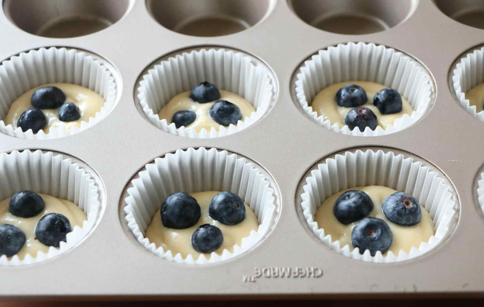 6.蛋糕模里放一个一次性纸杯。如果没有模具,可以换成结实的纸杯。然后把面糊挤成两半,放几颗蓝莓;