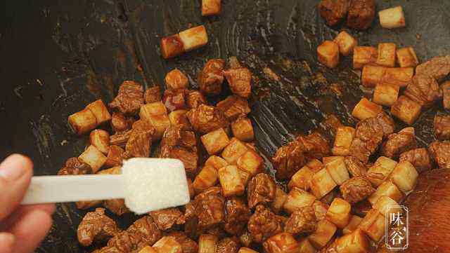 7.重新上油,将牛肉粒放入锅中翻炒;