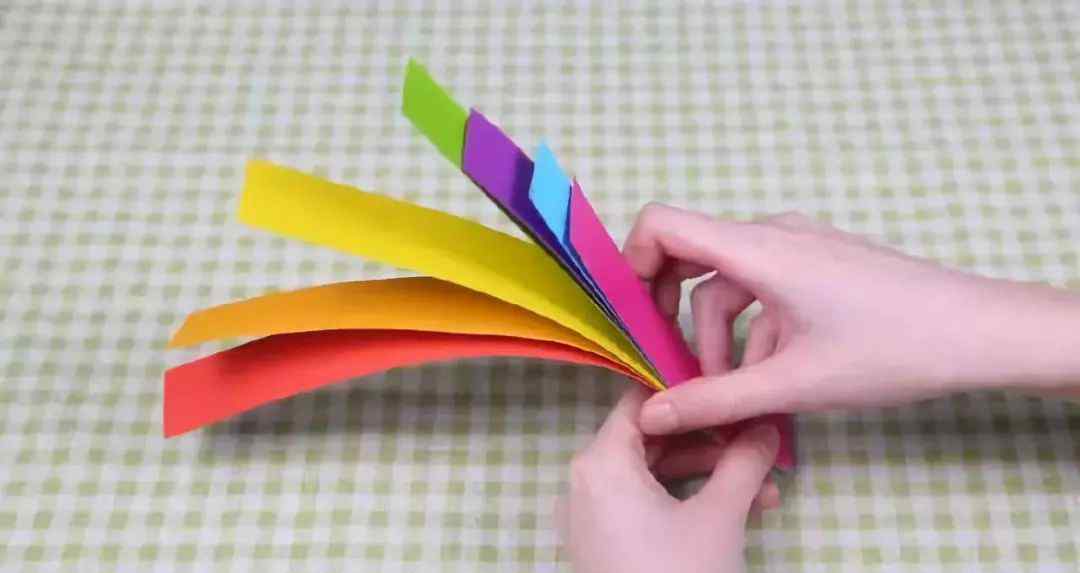 在不同颜色的纸板上剪下长条(点:每种颜色的长度依次递减,一共剪七条。)