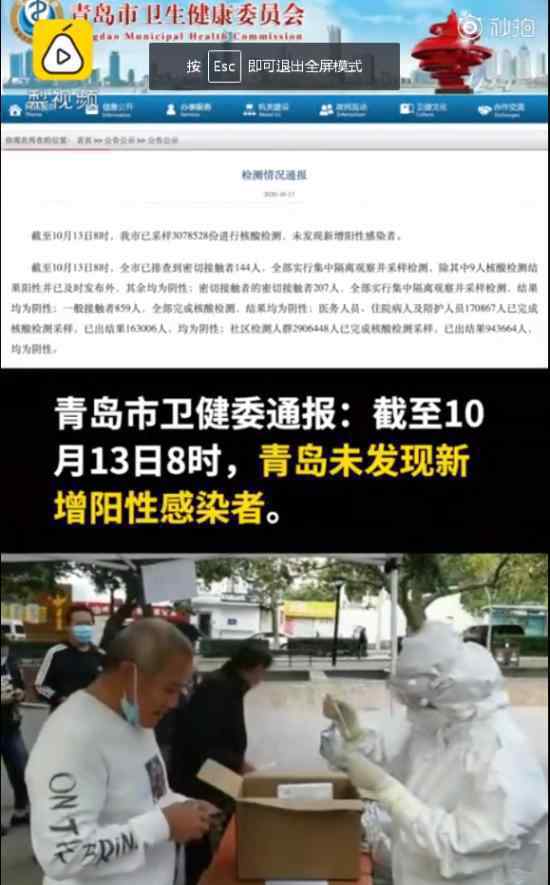 据青岛市卫生和卫生委员会称,截至10月13日8时,青岛市已抽取3078528份样本进行核酸检测,未发现新的阳性感染。