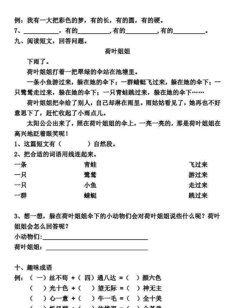 小动物:_ _感谢荷叶姐为我们遮风挡雨。______