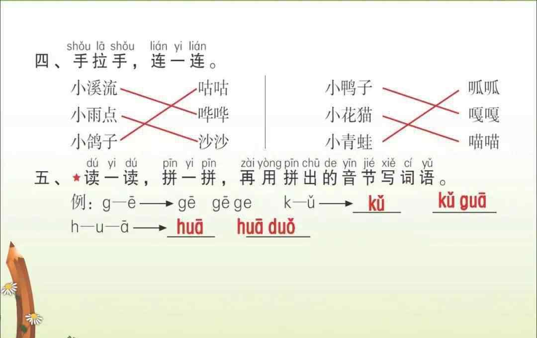 三拼音节:如“guā”,拼写时。g应该读得轻,u应该读得快,a应该读得大声。