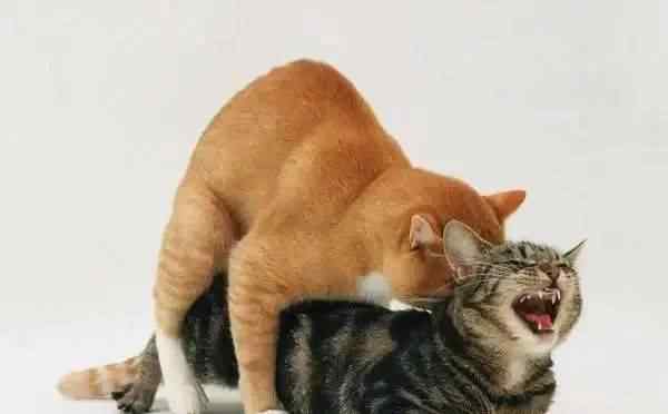 2.母猫会蹲下。公猫用牙齿咬住母猫脖子的松弛的皮肤,爬到母猫的背上,用前爪摩擦母猫的两侧。