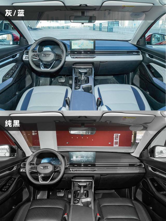 与前脸无异,四代帝豪的内饰同样有着不少星瑞的影子,尤其是灰蓝色的搭配,如果不是中控台的造型有显著差异,你很容易误认为走进了星瑞的车内。而纯黑色的内饰其实运动感不错,但就色彩搭配上来说有些太过单调,观感上没有灰蓝配色的效果出众。四代帝豪在内饰的设计和布局上,与三代帝豪相比发生了翻天覆地的改变,比如悬浮式中控屏、液晶仪表盘、中控台风格,以及扶手台的设计等等,其变化肉眼可见。至于用料上四代帝豪也算厚道,软性材质覆盖、皮革缝线设计,以及镀铬材质点缀在四代帝豪的车内都有出现。