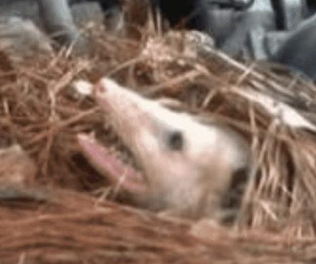 杰克刚刚下车,就听到发动机舱里传出一些异响。感觉情况有点不对劲,他就跑到皮卡车前面,打开汽车的发动机舱,结果在里面发现一堆杂草。杰克以为这是什么小动物给运到这里的,就准备把这些杂草给丢出去。结果手刚刚碰到杂草,就从杂草中间冒出一个动物的头,这个动物还差点咬到杰克。