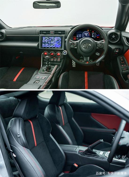 内饰的设计上,丰田GR86采用了对称式的中控台,整体的色调以黑色为主加上红色线条的点缀,也营造出了浓厚的运动气息。还配备有7英寸的液晶仪表盘和8英寸的中控显示屏。