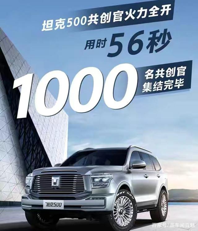 在上个月30号,坦克品牌官方开启了“共创官招募活动”,也就是提供1000人可享优先提车、终身免费基础保养等权限。并且,依照坦克品牌官方后续给出的宣传海报可以看出,在活动开启之后的56秒,该项活动的首批一千人,也算是首批一千台新车,便被抢光。那么,到底坦克500具备何种魅力,才能让它获得如此高的关注度呢?