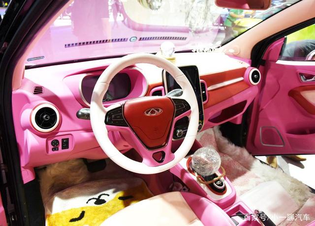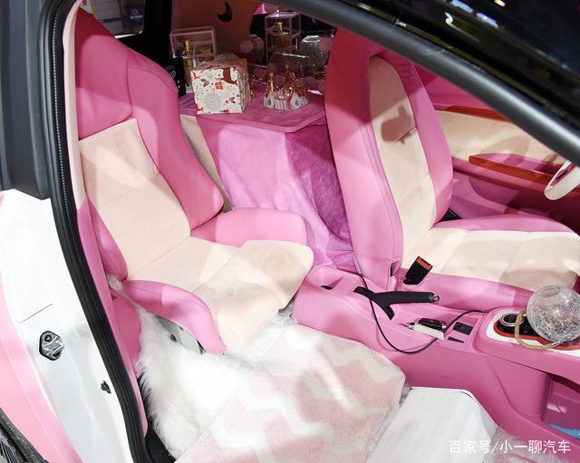 进入车内部分,“男士止步”的气息迎面而来,整个车内包括中控台、车门内饰板以及座椅等位置,基本都是粉色的涂装,另外还有少量的白色点缀,明显的女士专属。