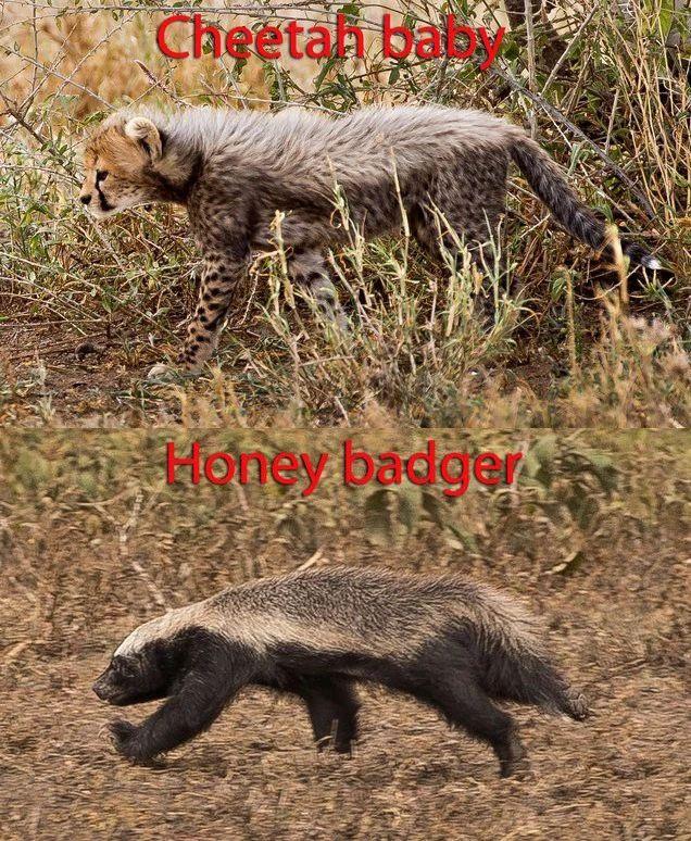 实际上,由于掠食者很少对蜜獾下手,有的大型掠食者甚至演化出了一种提高幼崽存活率的策略——模拟蜜獾的皮毛颜色。1976年,猎豹行为和生态学专家兰德尔·伊顿提出了一种现象,从猎豹出生直到两个半月大,一直在模仿蜜獾的毛色,即像蜜獾那样躯干上部呈银灰色或近乎白色,下部分则为黑色,他认为这是小猎豹对蜜獾的拟态。