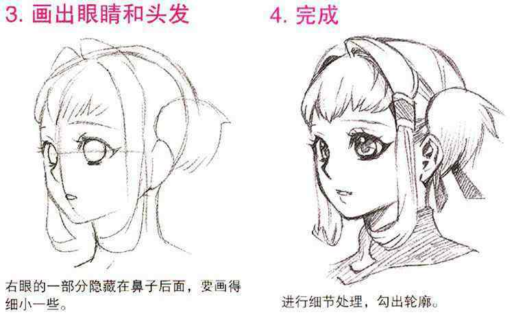 3.画眼睛和头发:右眼的一部分藏在鼻子后面,所以画小一点。