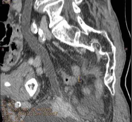 扫描后重建泌尿系统显示左侧输尿管中部有结石。