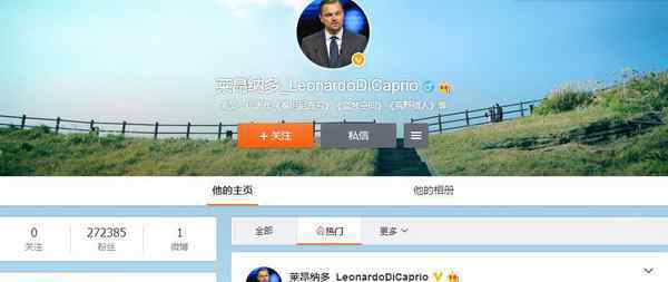 10月8日,奥斯卡影后莱昂纳多·迪卡普里奥开通微博,发布了第一条微博“你好,中国!我是莱昂纳多。”向中国粉丝问好。目前粉丝人数已经超过27万,喜欢人数已经超过7万。