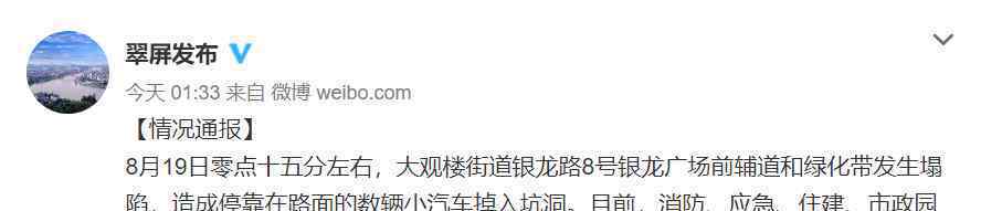 8月19日0时15分左右,大观楼街银龙路8号银龙广场前的辅路及绿化带坍塌,导致停在路上的几辆车陷入坑洼。目前消防、应急、房建、市政园林等部门正在现场处置。事故原因正在进一步调查中。详情将进一步报道。
