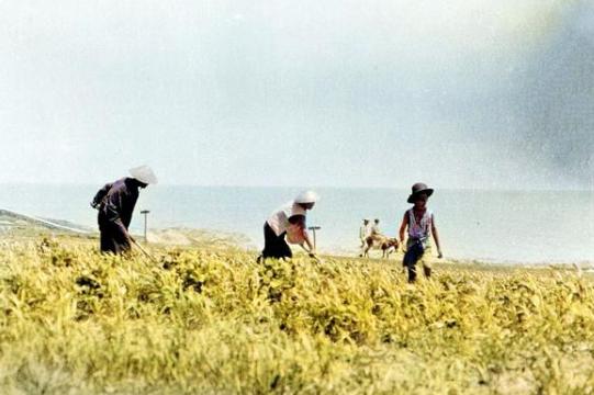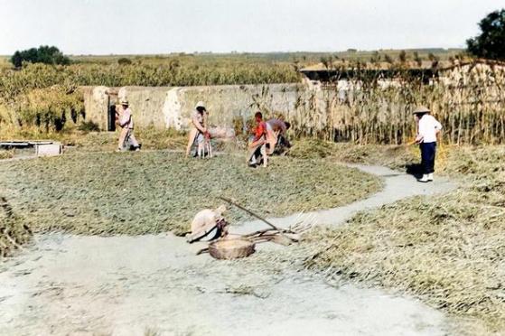 1918年在田地里面晒粮食的村民。那时候的粮食是需要自己收割以后自己晒的,如果村民们想要得到面粉,还需要自己把这小麦磨成面粉。那时候很多小孩子会捡这些买麦粒,那、拿回去换一些食物吃。