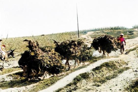 1918年走在农田里的毛驴。那个时候出行的方式主要是依靠动物的劳动力为主,在1918年的时候,自行车都还没有被普及。