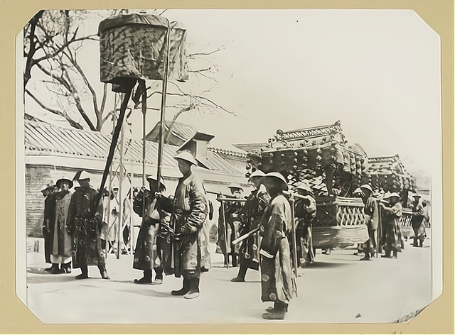 第二张照片,仔细辨别的话,我们就会发现这是一张官员出行的场景。可以很明显的发现,当时清朝政府十分的铺张浪费,他们这次出行之中安排了大量的人员。在队伍的一开始,出现了两个敲锣的工作人员。