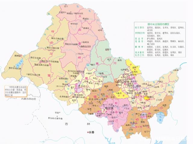 也许大家发现了一个特点,黑龙江省下辖的各个专区,基本上都是以河流命名的,例如松花江、牡丹江、合江、嫩江等等。50年代的地级市面积都不大,仅仅管理了郊区和市区,外围的各个县,则隶属于专区管理。至于专区,则是五六十年代的一种区划模式,相当于现在的地级市,但管辖区大于地级市,一个专区相当于两三个地级市。