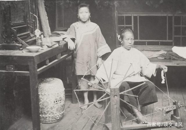 在清朝,大多普通百姓家中的衣服都是自给自足,用自己纺织的布匹,自己裁剪做衣服。也有一些家庭手工作坊,织出一些棉布拿到市场上售卖,但大多形不成产业。这张照片中纺线的纺轮一直到解放后还有很多家庭在使用,可以说延续了数百年的历史。
