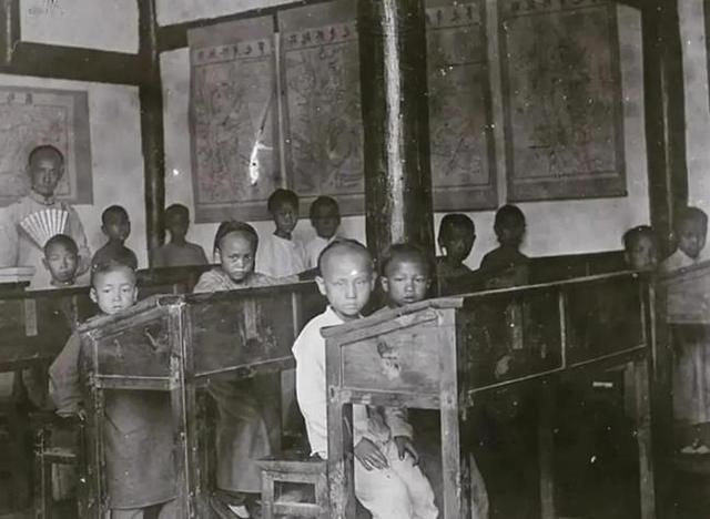 这是一个清朝学堂里孩子们在读书的情景。在清朝普通老百姓的孩子是很难有机会接受正统的教育的,一般有钱人家开设私塾或学堂,聘请教书先生专门教孩子上学。到清朝后期,学堂经过多次改革,逐渐正规,也融入了很多先进思想。从这张照片里发现,这应该是一个正规的学堂,后面站着年轻的教书先生,手里拿着扇子。