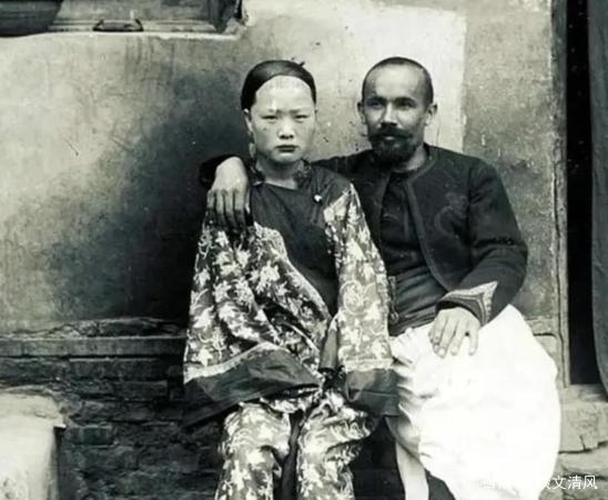这是一个个新婚夫妇的照片,新娘穿戴喜庆,但从他紧皱的眉头能感受到,并没有丝毫幸福的感觉。而且右侧的新郎官,明显年龄也比她大很多。在男尊女卑的封建社会,男人是可以有三妻四妾的。又或许这只是那人新纳的一个小妾?