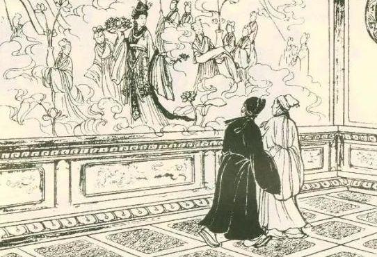 三个人到京城后,看见郊外有一座古寺庙,他们就进去稍作休息。进入庙门,看见僧房墙壁上挂着一绢画,画上是一位十六七岁的貌美佳人。