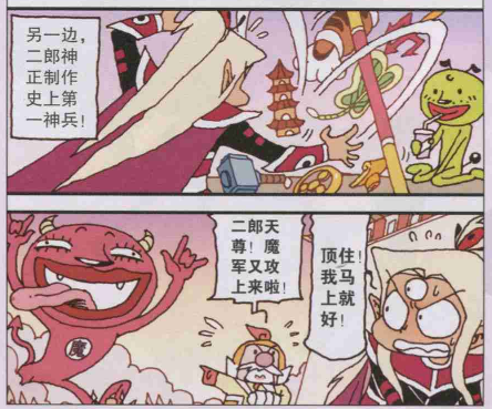 先前讲到了正因为笑天跑到了前线找二郎神,二郎神才终于发现了笑天的作用,那就是利用笑天的恶心来逼退敌人。于是乎一人一狗联手杀得魔军四散溃逃。结果没想到魔军才刚退没多久又一次卷土重来,而这一次还带来了秘密武器。世间居然还有跟笑天一样恶心的物种,两个人杀得昏天暗地,最辛苦的还是夹在中间的二郎神了。