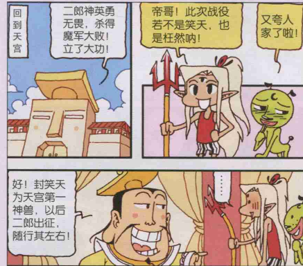 二郎神这次立下了赫赫军功,但也不忘为笑天请功。结果帝哥一句话就让二郎神后悔说出口了,想到以后都要经历刚刚那场痛苦。二郎神一心就只想要退役,看来以后二郎神战无不胜的传说中必然会有笑天的身影了。