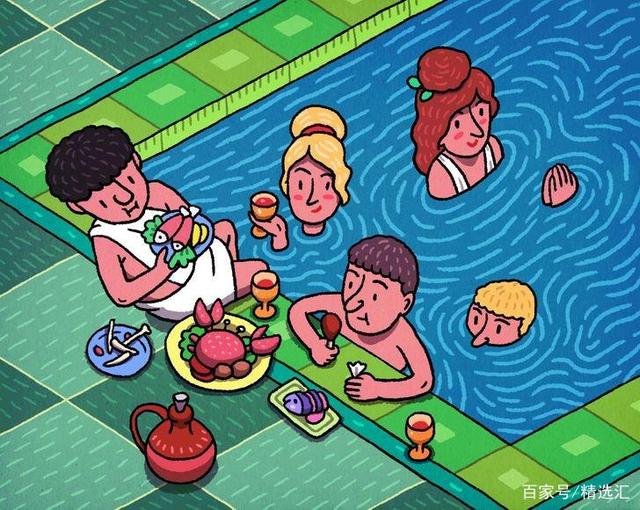 有的人习惯于在淋浴和泡浴缸的时候唱歌,甚至看电影。而在古罗马时期,人们在公共浴池里不仅会刷牙,还会一起吃东西和玩游戏。作为一个被认为极具社交性质的场所,这个地方被认为是结识新朋友和社交的好地方。对于古罗马浴室区域下水道的研究发现,人们在那里吃过的食物种类很多,不仅有牛肉、羊肉、猪肉和家禽,甚至还有贝类和甜点。