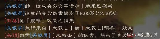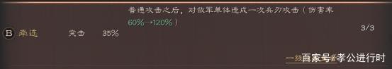 该段效果十分简单粗暴,让已方全体获得一个普攻后35%几率触发额外单体兵刃伤害的特性。虽然没有明说,但懂的人都知道这其实就是一个伤害为122%的突击战法,差不多就是B级战法【牵连】的水平。伤害不高,但重点是全体享有。