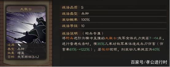 大戟士赋予了全队全程普攻额外触发伤害的特性,即可速攻,也可狗皮膏药似的打全程。但总的来说,伤害的核心属性还是武力,合适该兵种的武将自然还应该是武力见长,谋略武将放到这里,即便触发伤害也和刮痧无异。