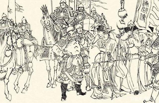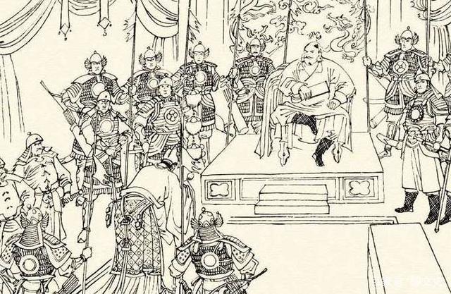 宋朝使节参见金国元帅,一看两旁刀枪林立,吓得头不敢抬,眼不敢看,对金国提出的合并条件满口应诺。