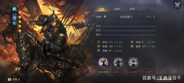另外,新武将曹彰的主战法五兵之烈,本身拥有极为恐怖的输出能力。尤其是在携带弓类宝物的时候,更是能够让战法目标数变为3,从而打出更加恐怖的输出。当然,由于五兵之烈的有效距离为4,因此只有曹彰站在中军才能攻击全体敌军。不过转换为弓骑兵之后,那么曹彰即便站在大营,也能顺利攻击敌军全体,从而打出超强输出。