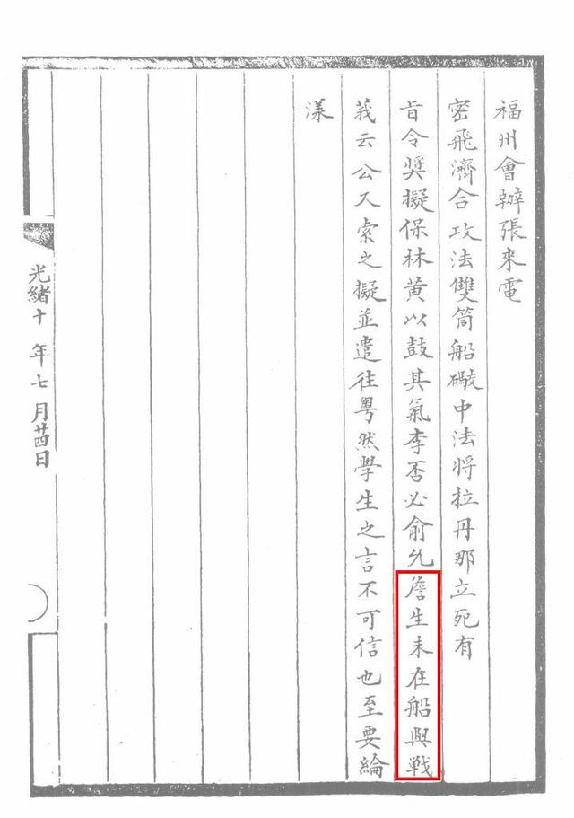 9月8日,张佩纶复电:“林、黄已随李新明回粤,张参革不可用,詹未与战,学生不可深恃。”(《电稿》第4518页)意思是说,林国祥、黄伦苏已随老将李新明回广东,张成被革职不可用,“詹未与战”明确指出詹天佑没有参与战斗。9月13日,张佩纶再次来电:“詹生未在船与战。莪云,公又索之,拟并遣往粤,然学生之言不可信也。至要。”(《电稿》第4609页)此电再次强调,马江之战爆发时,詹天佑不在军舰上,没有参加战斗。报文中“莪”指原船政大臣何如璋,字子峨。