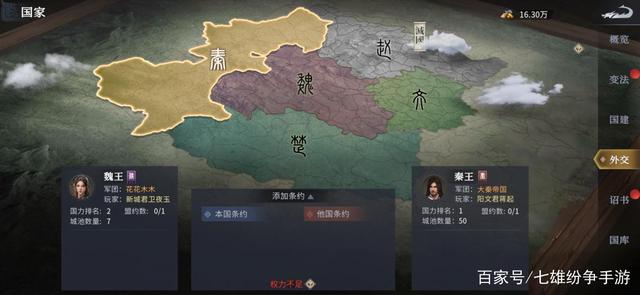 那么这个团体的概念再上升就成了国家之间的博弈,这也是《七雄纷争》的一个特色,每个国家的君主是由该国势力最强大的军团长担任的,而我们则是他的后援团。我们自身发展壮大的同时,国家的整体实力也会增强,而强国的话语权相对也会更高,此时是选择与他国合纵又或者是连横其他盟约国,这就在君主的判断了。但常言道“得道者多助,失道者寡助”,一味进攻的暴君势必会遭到其他国家的联合反击,与人为善的国家才能得到尊重。