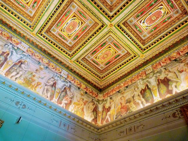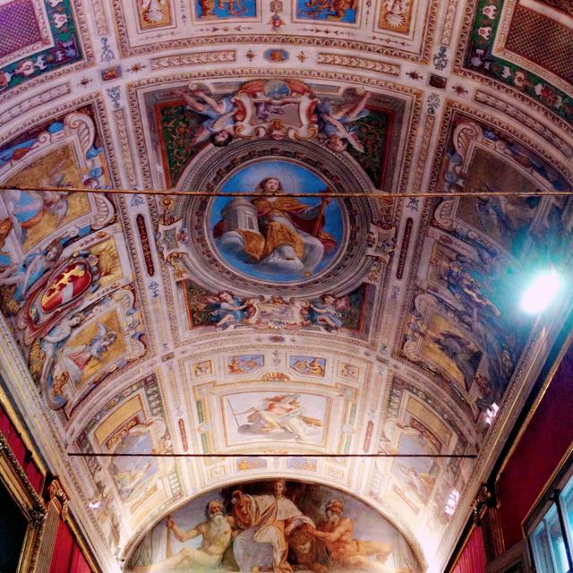 不同于皮蒂宫外部的陈旧感,内部的装饰称得上金碧辉煌,美轮美奂。头顶上方壁画中人物的神态和身段都被刻画得栩栩如生,展现出了当时的精湛技艺。
