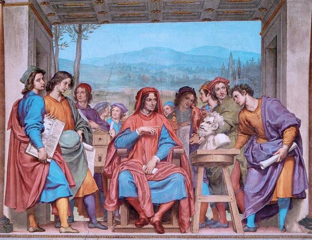 最引人注目的是另一幅挂在墙上的壁画,这幅画展现的是美第奇家族的生活状况。里面各型各色的人物代表了家族内部的人员。他们头戴帽子,穿着特有的服饰,聚集在一起。