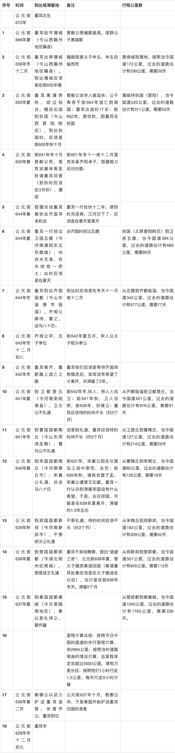 重耳一行从蒲地出逃开始,历时十九年,历经狄齐卫曹宋郑楚秦八国,行程超过万里,堪称万里长征。最终到达秦国陕甘地区,才找到机会养精蓄锐、秦人作靠山,才有了咸鱼翻身的机会,最终杀回晋国,夺得君位,而且称霸春秋。