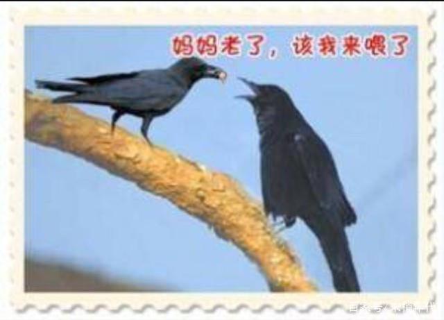 李密的《陈情表》中说“乌鸟私情,愿乞终养。”私人的尽孝,大于对朝廷的尽忠。白居易的《慈乌夜啼》中说:“慈乌失其母,哑哑吐哀声。昼夜不飞去,经年守故林。夜夜夜半啼,闻者为沾襟。”白居易以“慈乌”自喻,寄托“舐犊情难报,未尽反哺心”的无尽悔恨与哀伤。《增广贤文》中又说:“羊有跪乳之恩,鸦有反哺之义。”乌鸦尚有衔食喂母的情义,为人子女的更要懂得孝顺父母。“乌鸦反哺”的故事更是广为流传,在所有鸟类中乌鸦是最懂得孝敬父母,知恩图报的鸟。
