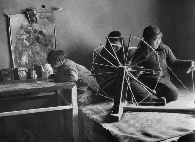 1943年,河北,在地道洞口纺纱。摄影/石少华