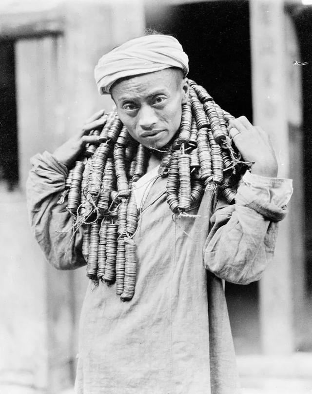 20世纪10年代末,四川,携带13500枚铜钱的男子。摄影/西德尼·甘博