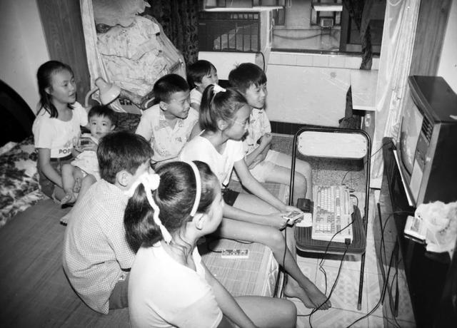 1993年8月,重庆市渝中区蒲草田街,在放假的日子,孩子们围在电视机前用当时流行的小霸王播卡游戏机兴致勃勃地玩电子游戏。罗大万/摄影
