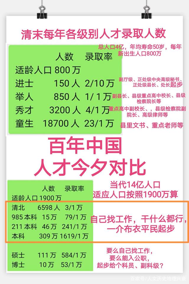所在在清朝人才真的很稀缺!相对应的给每和级别的人才待遇给的很好;再看当今的高考和研究生考试,录取比例!想想学历贬值真的很大!如下图,前后相隔100年,各级人才给的待遇!就知道在100年前,学历有多少稀缺、而今有多么贬值了!可以这样说吧,如今的博士和硕士毕业能够给到百年前的童生待遇水平的起点就已经很不错了!大学生就更是普通人才了,再加上1999年大学大规模扩招,高学历人数20年的积压效应!情况更不乐观!