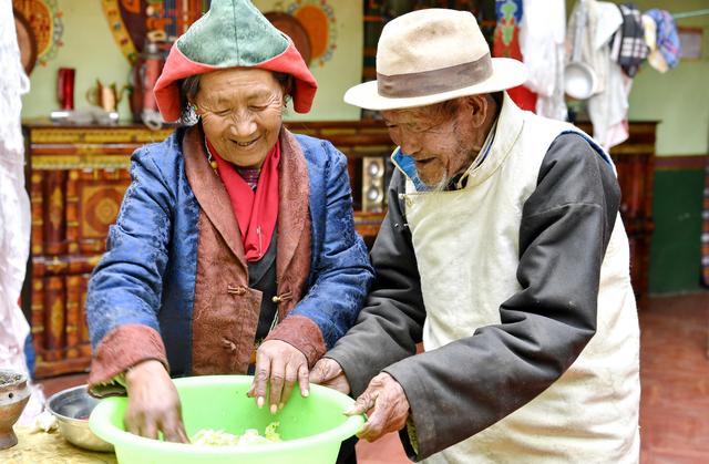 索朗(右)和老伴穷阿洗菜(4月16日摄)。