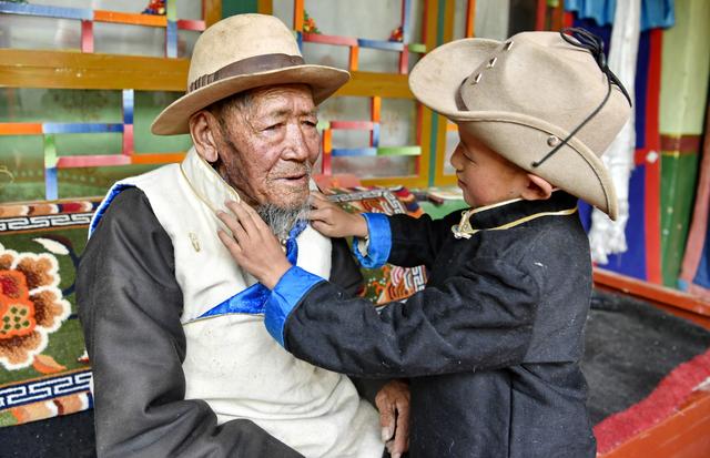 索朗的外孙旦增晋美帮他整理新衣服(4月16日摄)。